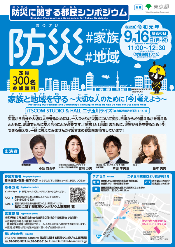 9月16日に、iTSCOM STUDIO & HALL二子玉川ライズにて行われる「防災に関する都民シンポジウム」